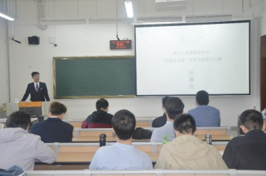 于第二教学楼A214教室召开比赛宣讲会,学生负责人孟祥毅向大家介绍本次“我是外交官”外交风采展示大赛的赛制和相关事项,并且解答同学们对于本次比赛的疑问。