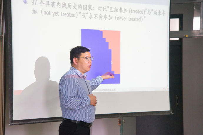 接着,陈老师深入讲解了此项研究的设计方案。他指出,基于各个国家加入“一带一路”时间点的差异性,该项研究创建了一个时间跨度为2014—2020年、包含195个国家的面板数据集,以“国家——年”作为分析单位,用“理想点距离”和“一带一路”参与情况作为自变量,采取“政府责任感”和“清廉(腐败)程度”两个指标作为因变量,选择“人均GDP”和“GDP增长率”、“政体类型”、“中国出口占比”和“中国进口占比”作为控制变量综合测量国家治理绩效。同时,该项研究采用固定效应模型、混合效应模型、匹配与双重差分结合方法以及因果调节效应分析来确保研究结论的稳健型。另外,该项研究还进行了一系列稳健型检验。