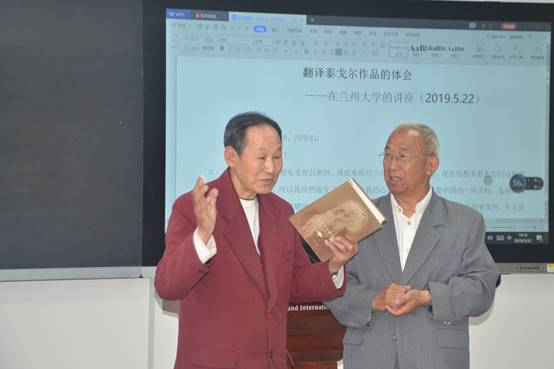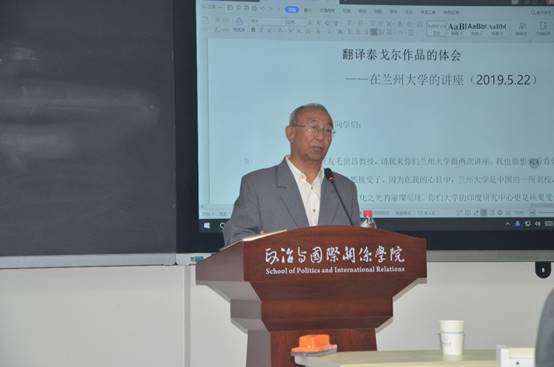 教授从泰格尔的生平、婚姻、子女发展以及翻译心得体会等几方面介绍了自己的研究成果。在谈到文学翻译时,他指出,几十年来的翻译校对实践经验,特别是最近5年来的《泰戈尔作品全集》的译校工作,使自己对翻译工作有了比较深刻的认识和新的体会。翻译指的是把一种语言文字的含义用另一种语言文字确切地表达出来,一般分口译和笔译两种方式:口译是将说一种语言的人所说的话用另一种语言说出来,让不懂前一种语言的人明白前者所说的意思,而笔译则依靠文字的转化,让不懂该文字的人能够明白。但是,教授认为笔译不是把作品中的外语单词所对应的汉语词汇简单地排列起来,而应当以本国语言使用习惯为基础,用本国的标准文字将另一种语言的作品的含义准确地译写出来,这种译写不是文辞的堆砌,而是对作品意蕴的确切表达,也就是著名翻译家严复所提倡的“信、达、雅”。