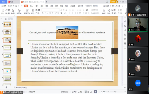 讲座伊始,耶列娜研究员指出,与许多国际观察人士的预期不同,“一带一路”在新冠肺炎疫情的巨大冲击下并没有失去动力。相反,它呈现出一种快速增长的态势。未来“一带一路”倡议将更加关注健康和绿色发展领域。疫情后,随着投资和贸易需求的进一步增加,“一带一路”倡议将在许多国家的经济复苏与基础设施重建中发挥更大作用。乌克兰作为首个支持“一带一路”倡议的国家,具备物流便利、位于与欧盟的自由贸易区两点优势。为更好地发挥在欧亚大陆的过境作用,乌克兰必须实现边境码头、铁路和公路的现代化建设。