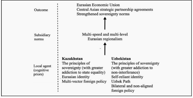欧亚理念是20世纪90年代末针对其南方邻国设计的,哈萨克斯坦通过特殊考虑乌兹别克斯坦的认知优先事项——不干涉主权、独立的国家身份以及关于一体化进程的想法,改变了这一设想。因此,产生了欧洲和亚洲地区主义模式的混合形式——欧亚地区主义。