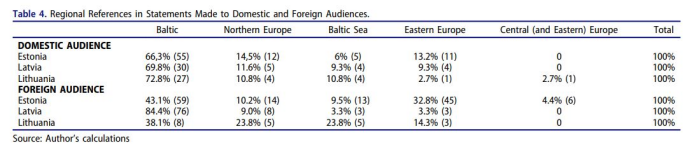 表4显示了波罗的海地区参考的同样普遍性,随后提及了这三个国家国内外受众的北欧术语。唯一的偏差是爱沙尼亚总统的发言,他经常向外国听众谈论东欧。总之,对国内外听众发表的总统声明的研究证实了与基于一般、年度或个人水平的分析相同的模式。