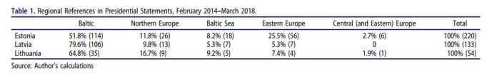 该表证实了早先建立的关于引用波罗的海三国的普遍趋势。“波罗的海地区”的受欢迎程度随着爱沙尼亚和拉脱维亚最近几任总统而上升,而“北欧”则排在第二位。爱沙尼亚总统图马斯·亨德里克·伊尔维斯再次提到“中欧(和东欧)”最少,“东欧”最多。