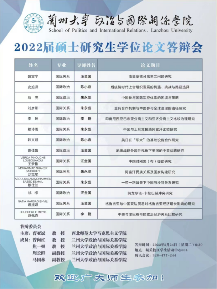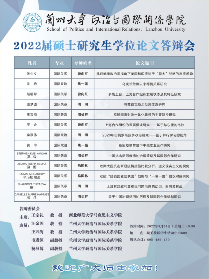 2022届硕士学位论文答辩评审会以线上线下结合的方式有序开展。本次线下论文答辩在城关校区学生活动中心602、604会议室举行,线上答辩以腾讯会议方式进行。西北师范大学马克思主义学院王宗礼教授、曹亚斌教授分别担任本次学位论文答辩委员会主席,汪金国教授、曾向红教授、焦一强教授、王四海教授、周长鲜副教授、马国林副教授、韦进深副教授、杨辰博副教授担任答辩委员会成员,张维维老师、宁彧老师担任答辩秘书。
