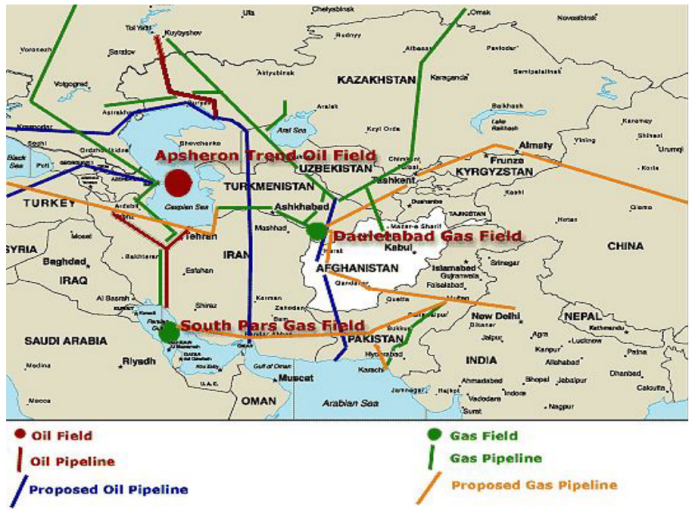 俄罗斯作为主要受益方的北线方案(从巴库到俄罗斯的格罗兹尼和蒂霍雷斯斯克,然后到俄罗斯黑海港口诺沃罗西斯克);美国和西方集团作为主要受益者的西线方案(一条路线是从巴库至第比利斯,最后以格鲁吉亚港口苏普萨为终点;另一条是巴库-第比利斯-杰伊汉管道);各方积极参与的里海管道联盟(多国、多家石油公司联合参建,路线是:从哈萨克斯坦的坦吉兹油田到蒂克霍雷斯斯克,再到黑海新罗西斯克的俄罗斯港口);遭到美国和其他国家共同反对的伊朗方案(从阿塞拜疆至大不里士,最后至伊朗的波斯湾港口);中国拟建的方案(从哈萨克斯坦到中国的塔里木盆地);存在竞争关系的土库曼斯坦-阿富汗-巴基斯坦-印度管道(TAPI管道)和伊朗提出的伊朗-巴基斯坦-印度管道(IPI管道);此外,美国2011年提出的“新丝绸之路”战略也包含了TAPI管道项目和CASA-1000水电项目(将吉尔吉斯斯坦和塔吉克斯坦的水电运送到阿富汗和巴基斯坦)。