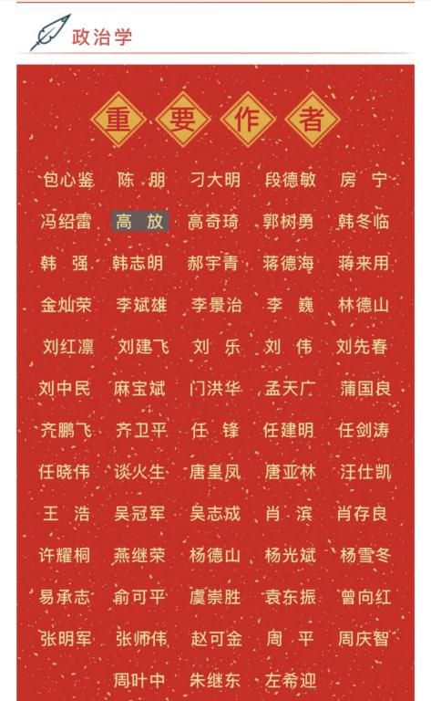 据悉,该榜单是复印报刊资料重要转载来源作者系列继2016年首次发布后的第二次发布,本次研制是根据各学科特征分别厘定了入选标准,依据复印报刊资料2016年—2018年间的转载数据和同行专家评议结果,最终遴选出883名人文社科学者。政治学共有63人进入榜单,其中笔趣阁 2人。