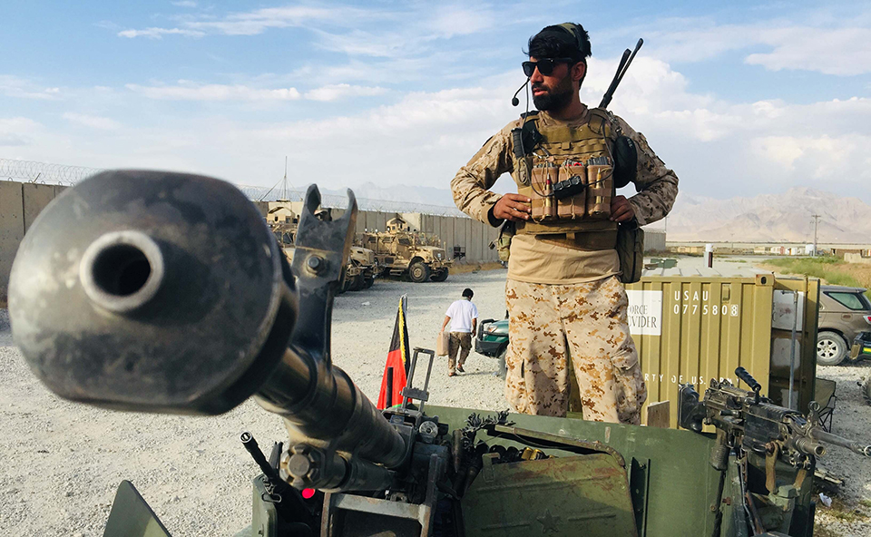 7月2日上午,阿富汗巴格拉姆空军基地门口,持枪哨兵已换成了亚洲面孔——阿富汗士兵。