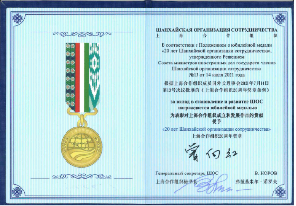 中亚研究所教授曾向红“上海合作组织20周年”奖章,以表彰他对上海合作组织发展所作的贡献。近日,曾向红教授收到上海合作组织寄来的奖章与证书。这是2011年杨恕教授荣获“上海合作组织10周年”奖章后,我校教学科研人员又一次获此荣誉。