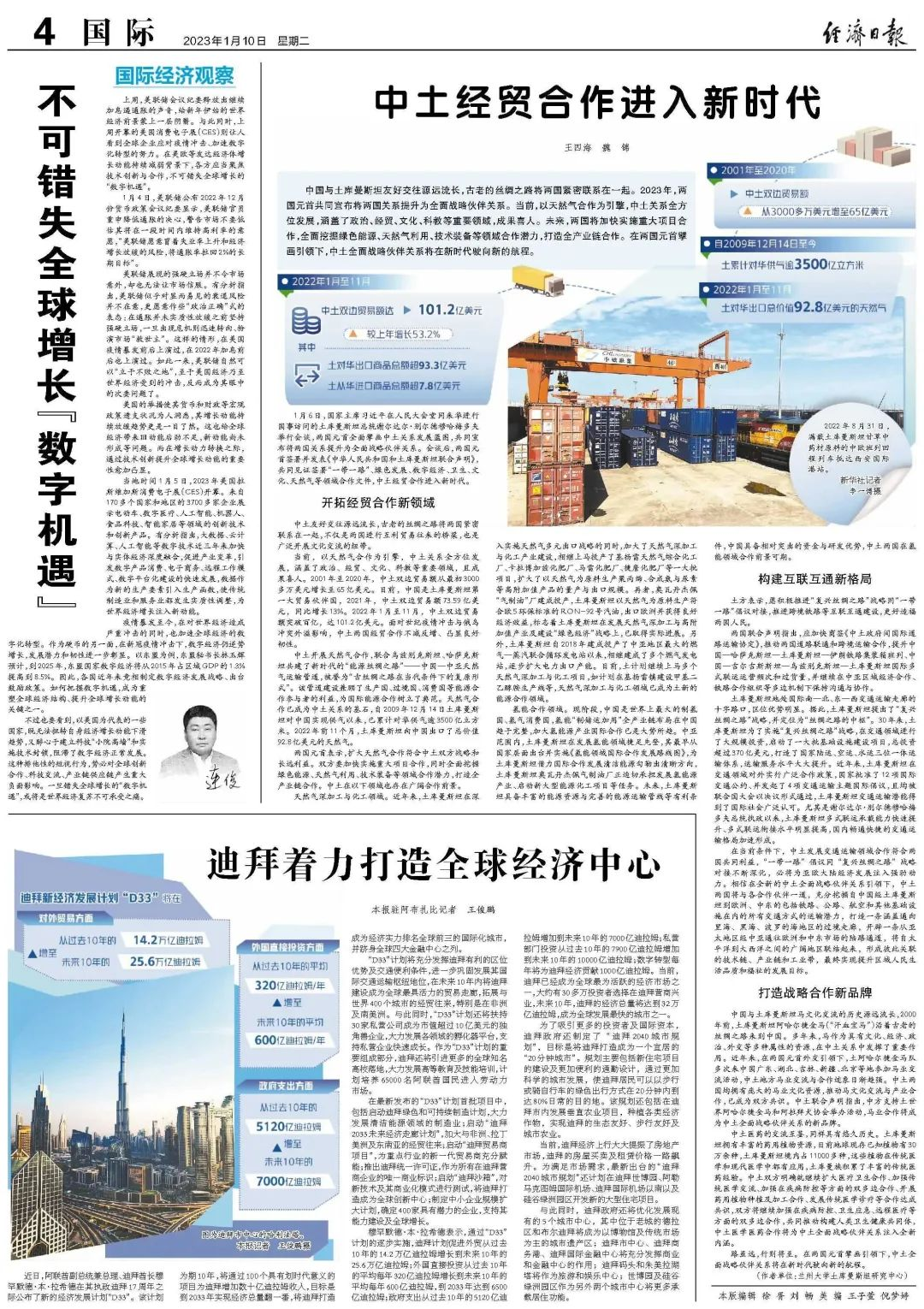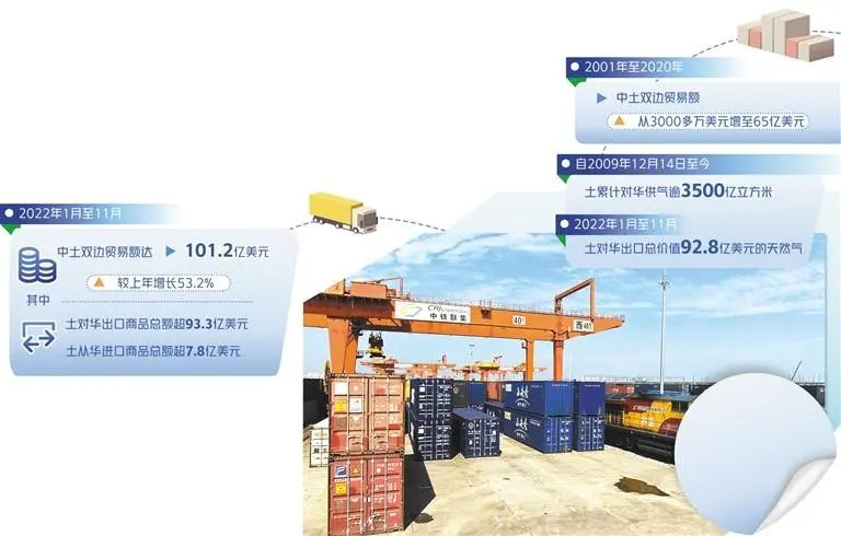 中土开展天然气合作,联合乌兹别克斯坦、哈萨克斯坦共建了新时代的“能源丝绸之路”——中国—中亚天然气运输管道,被誉为“古丝绸之路在当代条件下的复原形式”。该管道建设兼顾了生产国、过境国、消费国等能源合作参与者的利益,为国际能源合作树立了典范。天然气合作已成为中土关系的基石,自2009年12月14日土库曼斯坦对中国实现供气以来,已累计对华供气逾3500亿立方米。2022年前11个月,土库曼斯坦向中国出口了总价值92.8亿美元的天然气。