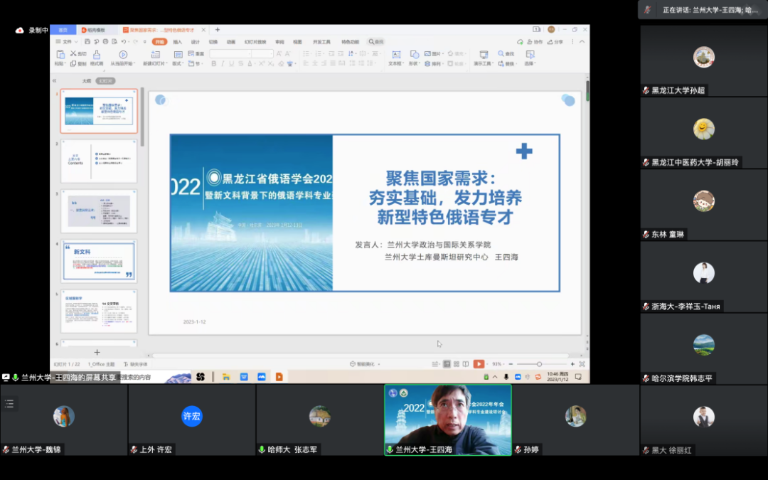 土库曼斯坦研究中心主任王四海教授受邀参加“黑龙江省俄语学会2022年年会暨新文科背景下的俄语学科专业建设研讨会”会议,并在主会场做题为“聚焦国家需求:夯实基础,发力培养新型特色俄语专才”的大会发言。