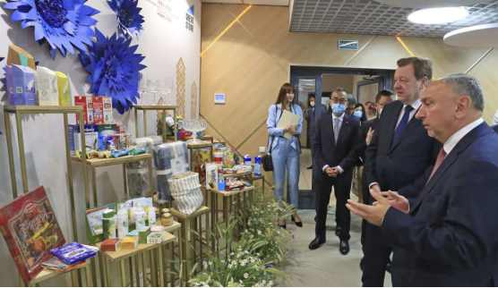 2022年7月6日,在位于白俄罗斯明斯克郊区的中白工业园,嘉宾观看准备销往中国的白俄罗斯商品。(图源:新华社)