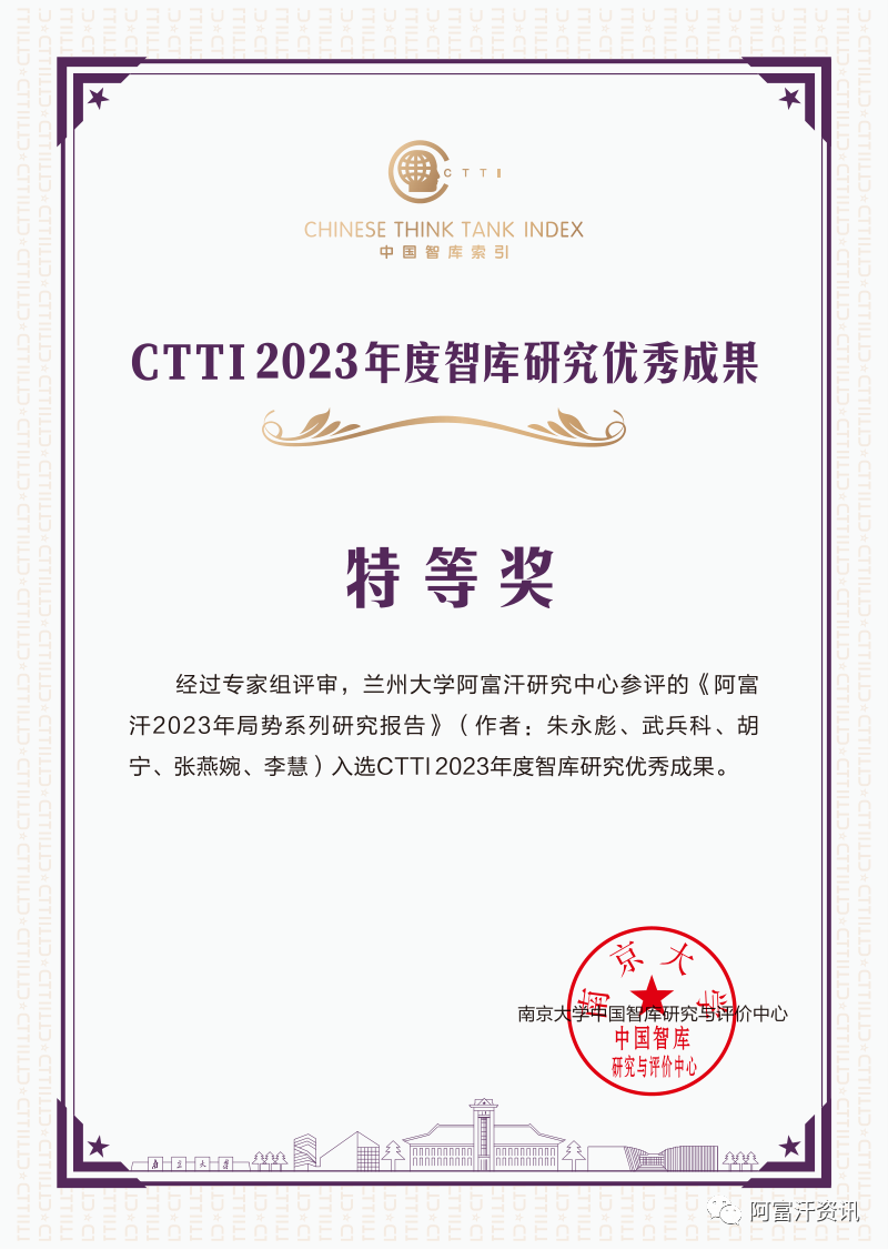 由中心主任朱永彪教授、武兵科讲师等共同撰写的《阿富汗2023年局势系列研究报告》荣获优秀成果“特等奖”。