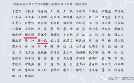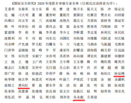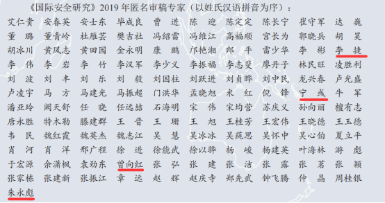 在涉国际安全问题研究上的积累和所具有的良好盛誉。如曾向红教授曾担任2019年度、2020年度和2021年度该刊匿名审稿专家,并于2023年受邀担任该刊编委;陈小鼎教授担任2021年度、2022年度匿名审稿专家;朱永彪教授担任2019年度、2020年度匿名审稿专家;李捷教授担任2019年度匿名审稿专家;杨辰博副教授担任2020年度、2022年度匿名审稿专家;宁彧博士担任2019年度匿名审稿专家。