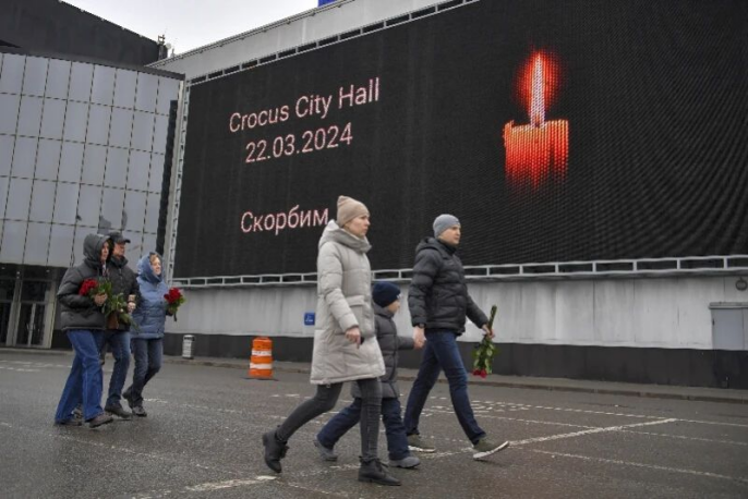 3月24日在俄罗斯莫斯科近郊恐袭事件现场附近拍摄的悼念遇难者的显示屏。新华社发