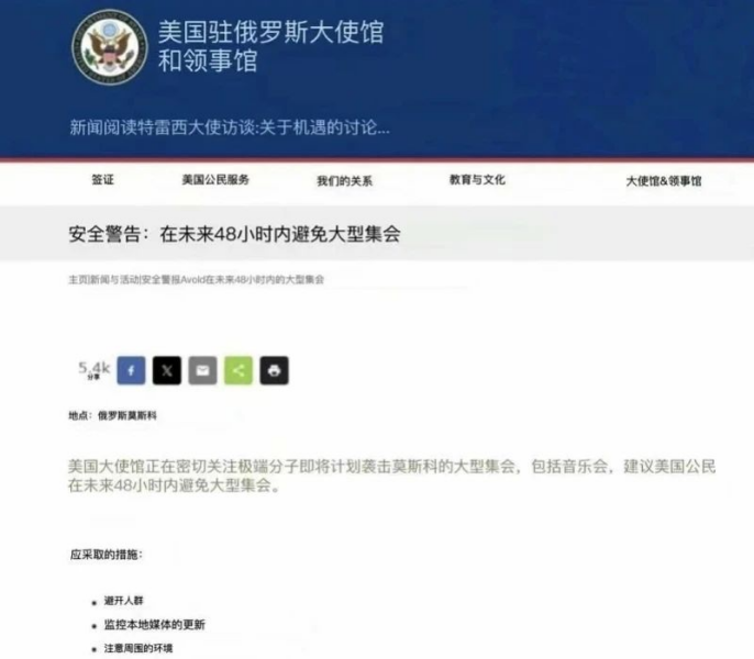 此前,美国驻俄罗斯大使馆曾于3月7日发布警告称,监测到“极端分子”正密谋未来几天内,在莫斯科发动袭击。“(美国)大使馆正在监测有关极端分子计划针对莫斯科大型集会(包括音乐会)发动袭击的消息,建议美国公民在未来48小时内避免参加大型集会。”美驻俄使馆提醒美国公民“避开人群、注意当地媒体消息、关注周边环境”。