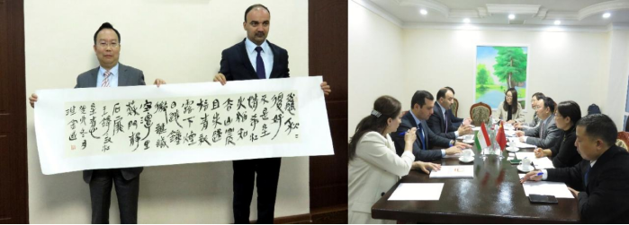 17日,在回国之前代表团一行拜访了中国驻塔吉克斯坦大使馆,同中国驻塔大使吉树民、使馆政治处与教育处官员就中亚地区形势、塔国内现状、中塔关系以及中塔人文教育交流与合作等问题进行了交流。