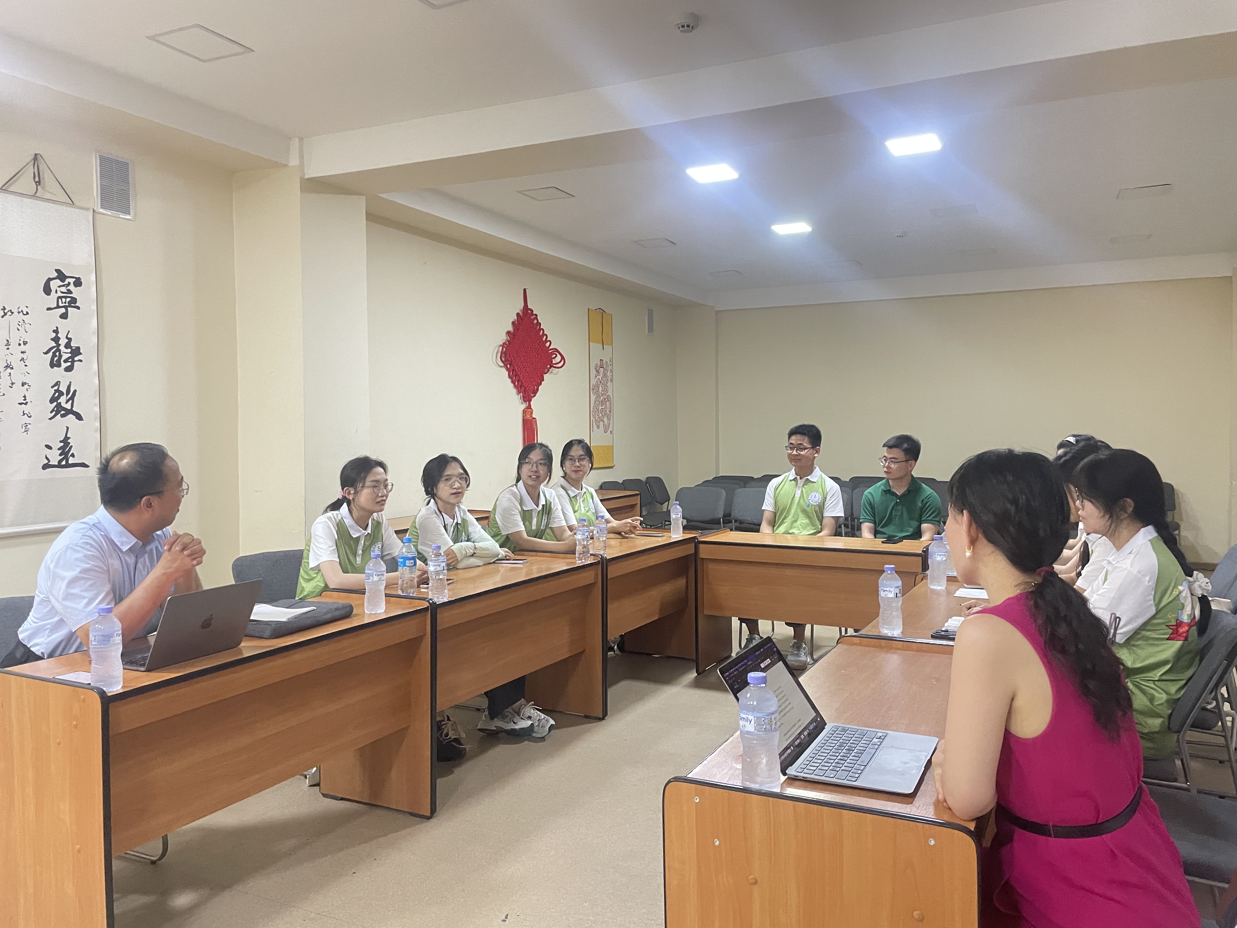在孔子学院任教的博士生韩彦雄进行了交流,韩彦雄为同学们分享了担任志愿者的心得体会。最后,学院师生参观了孔子学院,并了解HSK汉语水平考试以及乌兹别克斯坦民间中文学习情况。