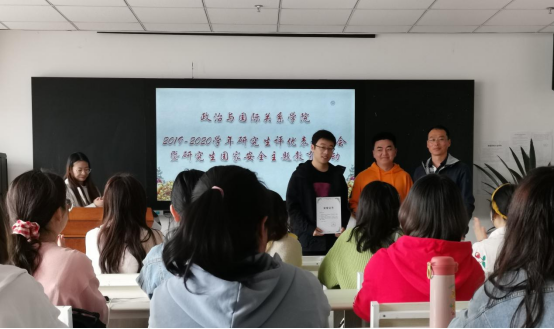 优秀毕业生李琳琳同学,优秀研究生标兵赵磊同学,优秀研究生曹佳鲁、魏宸宇同学,优秀研究生干部王文杰同学颁奖。之后,贾海燕老师宣布研究生优秀班级和研究生文明宿舍名单,并由2019级国际政治硕士研究生班班长及2018级女生513宿舍代表上台领奖。