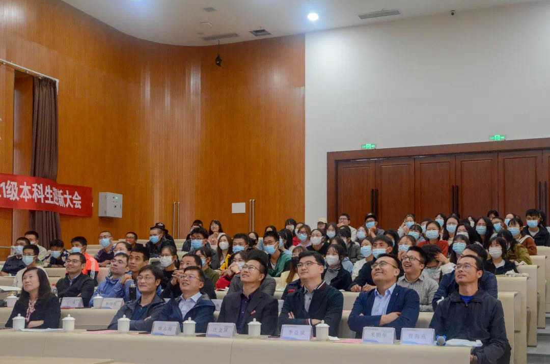 校歌。在铿锵悠扬的歌声中,大会议程有序开展。大会第二项,由学院党委记姚志海宣读班主任、学生副班主任聘任决定,并颁发聘书。大会第三项,院长汪金国致辞。汪院长对2021级新生表示热烈欢迎,并对学院情况进行简单说明,向同学们介绍学院发展的巨大潜力和相应的师资力量。同时,他对同学们寄予厚望,希望同学们都能继承并发扬学院奋发向上、积极进取、自强不息、厚德载物的精神和基因,从入校第一天就以健康的态度和饱满的热情投入到学习及各项文体活动中,把自己锻造成一个积极、乐观、阳光、宽容、感恩、成熟,并富有家国情怀和正能量的青年。此外,他要同学们要注意身体健康,注重保护生命、财产、交通、信息以及文化五个安全,树立四个自信,并严格按照老师要求进行学术研究,培养学术道德,做到“达则兼济天下,穷则独善其身”。他还强调,学术修养与人生之路是相辅相成的,希望学院团结一心,蒸蒸日上。最后,汪院长希望同学们早日适应大学生活,互帮互助,饱览群书,并祝福同学们学习进步,健康成长。