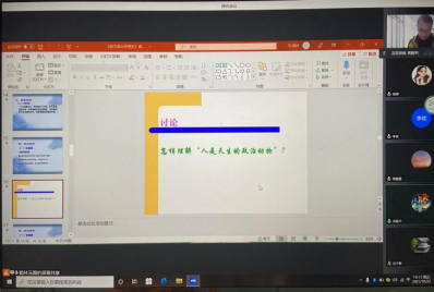 在西方政治思想史的课堂中,马国林老师通过增添思考题、创设情景题,引导学生积极开展讨论思考。首先,由同学们发言表达各自观点,马国林老师则根据同学们的回答进行评价补充。马老师通过情景设问的方法不仅帮助同学们获取了知识,而且锻炼了语言表达能力,一时间“云课堂”也变得热闹起来。