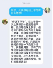 对于同学们来说,此次线上教学又有着不同的体验。2021级的杨婷同学说道:“网课开始了,还是老师熟悉的声音,还是熟悉的PPT模板,但不能和老师同学们面对面地交流沟通,心中不免失落。希望金城早日战胜疫情,我们能重返课堂!”2020级的刘璐璇同学也说出自己不同的感受:“我认为线上教学增加了老师和学生的互动性,有效解决了部分线下课堂中由于教室大、学生多而导致的后排学生看不清课件板书或者听不清讲授内容的问题。这种类似于一对一的教学方式也增强了课堂的体验感。”