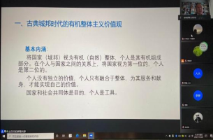 师生开展鹿鸣讲堂“正德”系列第三十七讲以及“政国”系列第二十九讲两场讲座活动。在“政国”系列第二十九讲的活动中,丛日云教授围绕西方政治思想史上的三次价值革命展开深入论述,用简洁的语言,生动的例子帮助同学们更好地理解西方政治思想史上曾发生的几次价值变革。线上学术讲座活动的举办,有利于扩展学生的学习思维,开拓新的学习视野,丰富学院线上教学内容,为线上教学提质增效。