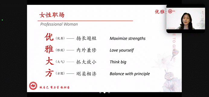 第四部分,陈欣老师从“刚”与“柔”两个方面阐述了如何在职场中方圆处事。陈欣老师以经典电影片段为教学素材,强调人际交往中“刚柔并济”对女性职场生涯的重要意义,并详细阐释了方圆处事的原则方法。
