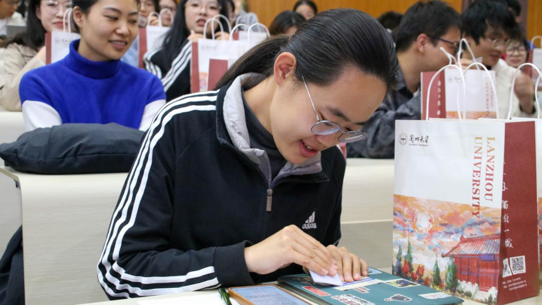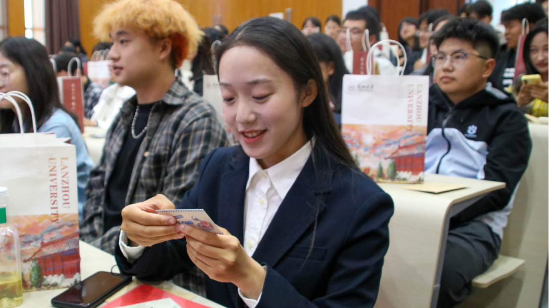 随后,学院精心策划的"幸运刮刮乐"活动拉开帷幕,由郭俊辰同学主持。每位新生都收到了学长学姐亲手书写的贺卡和一张幸运刮刮卡。游戏过程中,同学们收获了精美的学院文创礼品,并分享了初到兰大和政国院的感受与印象。现场欢声笑语不断,充分展现了政国院大家庭的温暖与活力。