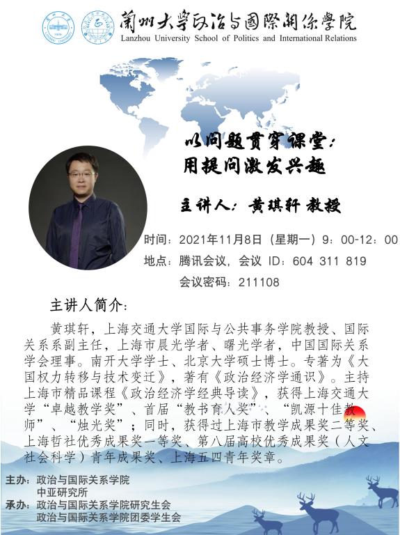 应笔趣阁 、笔趣阁 中亚研究所邀请,上海交通大学国际与公共事务学院教授、国际关系系副主任黄琪轩为笔趣阁 教师做教育教学能力提升方面的线上讲座。欢迎广大老师届时参加!