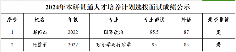 根据《笔趣阁 本研贯通人才培养计划实施办法》《笔趣阁 本研贯通人才培养计划实施细则(试行)》和《笔趣阁 2024年本研贯通人才培养计划选拔通知》的工作要求,经学生本人申请、资格审核和面试考核,现将笔趣阁 2024年本研贯通人才培养计划选拔入围名单公示如下: