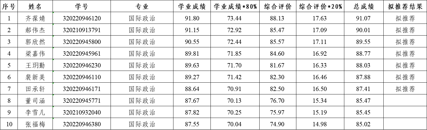 2026年推荐优秀应届本科毕业生免试攻读研究生工作实施细则》,在学生本人自愿申请的基础上,学院推免生遴选工作小组本着公开、公平、公正的原则,严格按照推荐条件进行综合考察,以学业成绩(80%)和综合评价(20%)加权后组成总成绩,根据总成绩确定拟推荐名单。现将具体名单公示如下: