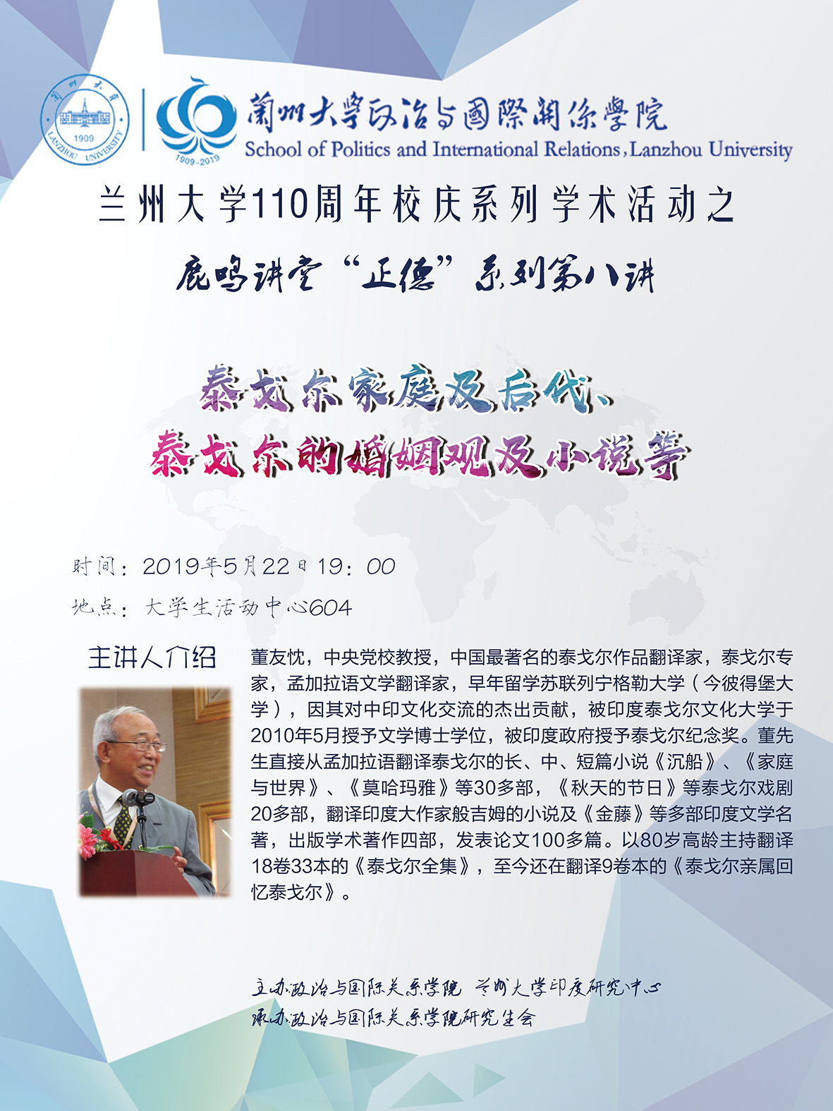 Invited by School of Politics and International Relations of Lanzhou University, Dong Youchen, Professor of Party School of the Central Committee of CPC, will hold an academic lecture in our School on May 22nd, 2019. All the teachers and students are welcome to attend.