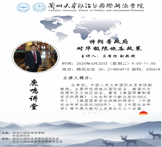 Invited by the School of Politics and International Relations of Lanzhou University and the Institute for Central Asian Studies of Lanzhou University, Associate Professor Zuo Xiying from the School of International Studies, Renmin University of China, will give an online academic lecture to teachers and students of the school.