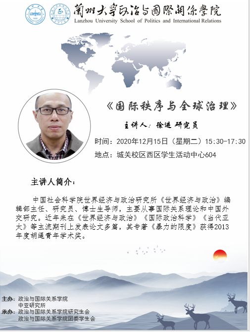 Invited by School of Politics and International Relations of Lanzhou University and the Institute for Central Asian Studies of Lanzhou University, Professor Xu Jin from University of Chinese Academy of Social Sciences will give an academic lecture to the teachers and students of our school. All teachers and students are welcome to attend.