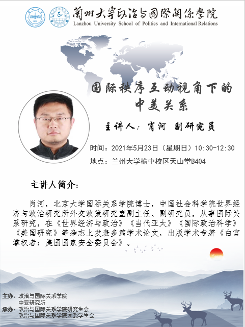 Invited by the School of Politics and International Relations of Lanzhou University and the Institute for Central Asian Studies, Xiao He, Deputy Director of The International Strategy Research Office, Institute of World Economics and Politics, Chinese Academy of Social Sciences, and associate researcher of the Editorial Department of World Economics and Politics,will give an academic lecture for the teachers and students of our school. All teachers and students are welcome to attend.