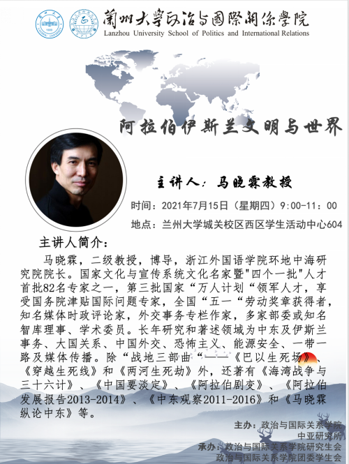 Invited by the School of Politics and International Relations of Lanzhou University and the Institute for Central Asian Studies, Professor Ma Xiaolin, Dean of The Mediterranean Institute of Zhejiang International Studies University,will give an academic lecture for the teachers and students of our school. All teachers and students are welcome to attend.