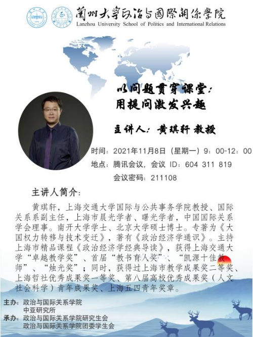 Invited by the School of Politics and International Relations of Lanzhou University and the Institute for Central Asian Studies, Huang Qixuan, professor of School of International and Public Affairs, Shanghai Jiao Tong University,will give an academic lecture for the teachers and students of our school. All teachers and students are welcome to attend.