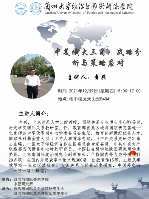 Invited by the School of Politics and International Relations of Lanzhou University and the Institute for Central Asian Studies, Li Xing, professor at Beijing Normal University,will give an academic lecture for the teachers and students of our school. All teachers and students are welcome to attend.