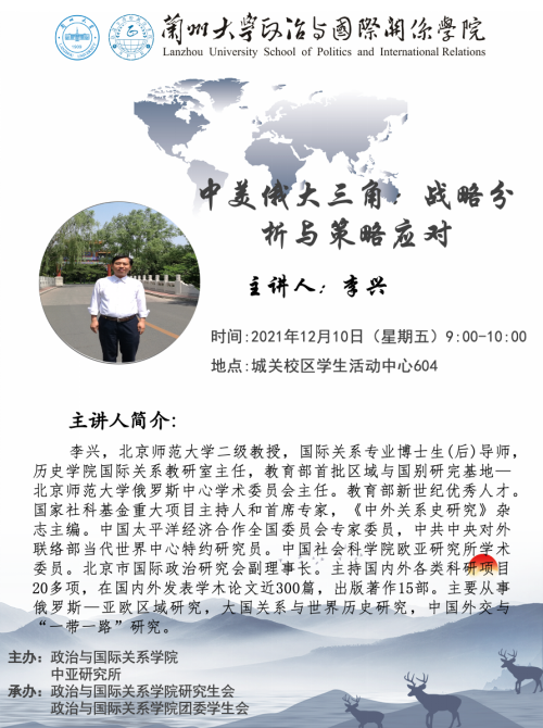 Invited by the School of Politics and International Relations of Lanzhou University and the Institute for Central Asian Studies, Li Xing, professor at Beijing Normal University,will give an academic lecture for the teachers and students of our school. All teachers and students are welcome to attend.