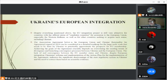 On the afternoon of 23 December 2021, at the invitation of the School of Politics and International Relations of Lanzhou University, researcher OlenaBorzenko from the Institute of Economics and Forecasting of the Ukrainian Academy of Sciences gave an online academic lecture entitled "Ukraine and European Integration" to our students and teachers. The lecture was hosted by Ms. Zhang Yini and attended by more than 200 students and teachers from the university.