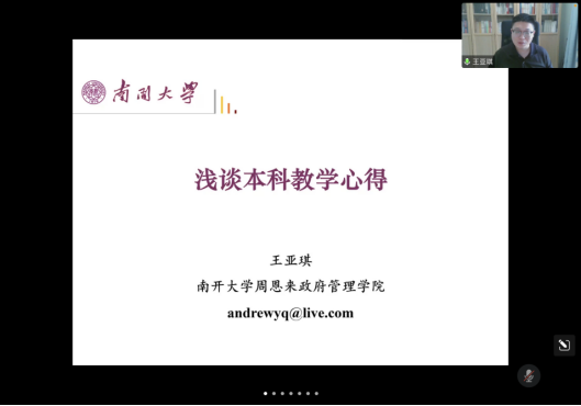 Mr. Wang Yaqi from the Zhou Enlai School of Government and Management, Nankai University, shared his undergraduate teaching experience. Firstly, in terms of teaching and learning, Mr. Wang believes that it is important to closely integrate theory and reality, and to focus on grasping students' needs in the process of imparting knowledge to them. Secondly, in terms of knowledge and philosophy, Mr. Wang pointed out that students should be cultivated with a sense of mission in the education process, so that they can foresee China and then serve China better.