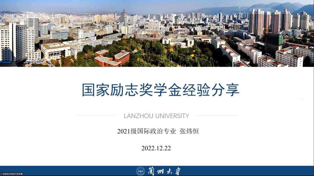 At 9:00 am on December 24, 2022, School of Politics and International Relations of Lanzhou University held an online experience sharing meeting for outstanding students. Zhang Weiheng and Chen Zimo, outstanding student representatives of our college, were invited to share their experiences. The meeting was presided over by the person in charge of the scientific research Practice Department, and some undergraduates of the college participated in the meeting.