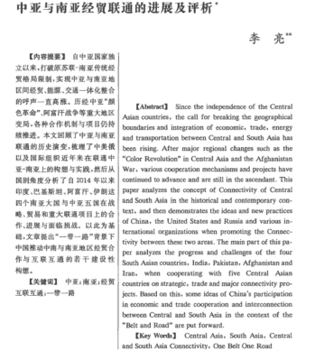 [Abstract]Since the independence of the Central Asian countries, the call for breaking the geographical boundaries and integration of economic, trade, energy and transportation between Central and South Asia has been rising. After major regional changes such as the "Color Revolution" in Central Asia and the Afghanistan War, various cooperation mechanisms and projects have continued to advance and are still in the ascendant. This paper analyzes the concept of Connectivity of Central and South Asia in the historical and contemporary context, and then demonstrates the ideas and new practice of China, the United States and Russia and various international organizations when promoting the Connectivity between these two areas. The main part of this paper analyzes the progress and challenges of the four South Asian countries, India, Pakistan, Afghanistan and Iran, when cooperating with five Central Asian countries on strategic, trade and major connectivity projects. Based on this, some ideas of China's participation in economic and trade cooperation and interconnection between Central and South Asia in the context of the "Belt and Road" are put forward.