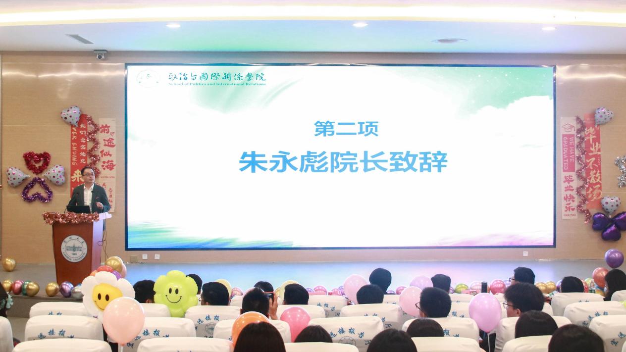 活动第二项,朱永彪院长致辞。他首先向全体毕业生表示热烈祝贺,为大家圆满完成这一阶段的学习旅程送上诚挚的祝福。朱永彪老师表示,同学们在见证学院发展与壮大的同时,更以实际行动积极投身学院建设,为学院赢得了诸多荣誉。随后,朱院长寄语毕业生,尽管部分同学即将迈出校园,步入职场,但他希望大家始终保持学习的状态,怀揣对生活的热爱与自信,不论身处何地、面对何事,都要坚定地相信自己。