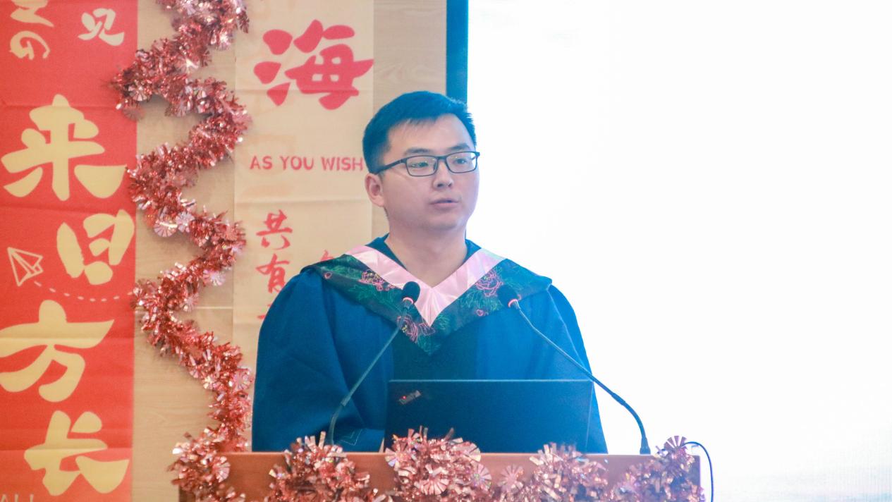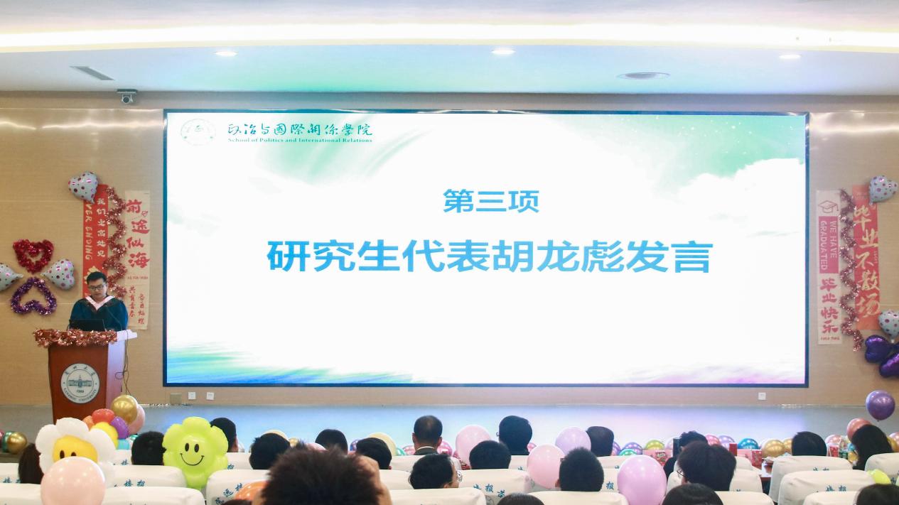 求学的七年时光,恰逢学院从初步创立迈向成熟的关键时期,能够亲身参与、见证学院的成长与辉煌,他深感自豪。同时,胡龙彪同学真挚感谢一路上所接受到的帮助——无论是学院的坚实支持、导师专的业指导,还是辅导员的贴心关怀、同窗的温暖陪伴,都将成为他人生中最珍贵的记忆。他强调,人生是一场不断奔赴更好自己的旅程,毕业不是终点,而是全新的起点。他鼓励同学们铭记“政国学子”这一光荣身份,不忘初心、勇敢前行。他相信,在未来的某一天,所有“小榛果”们都将在更高处再次相见。